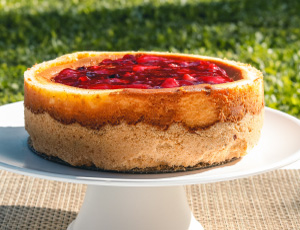 Base de galletitas, queso blanco, crema chantilly y salsa de frutos rojos.