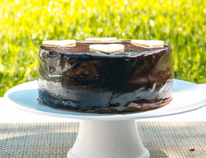 Galletitas de chocolate, mezcla de dulce de leche con queso crema, decorado con ganache de chocolate y dulce de leche.