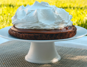 Base de marquise, dulce de leche, corazón de ganache de chocolate y merengue italiano.